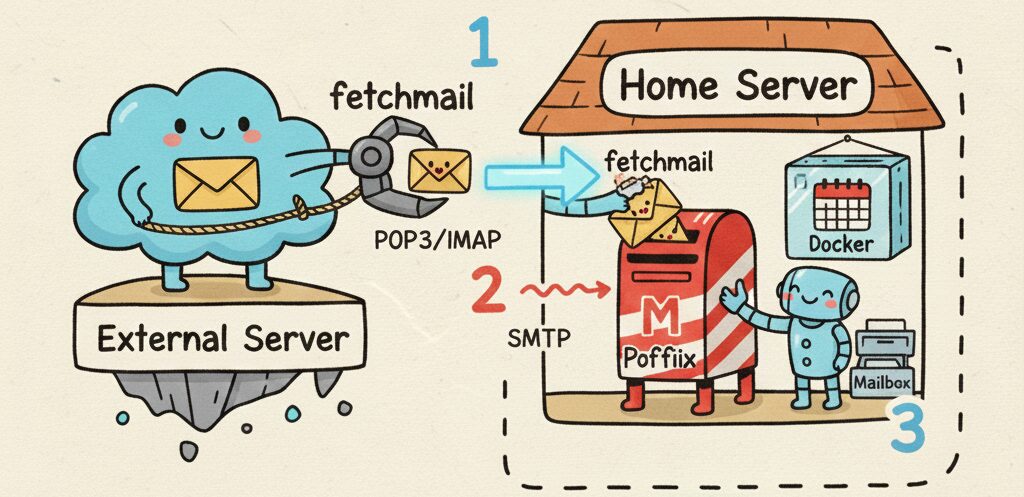 Gmailが提供してくれていた「外部メールアドレスをPOP方式で受信する機能」が廃止になるとのことで、自宅に立てているメールサーバーにその機能を実装することにした。